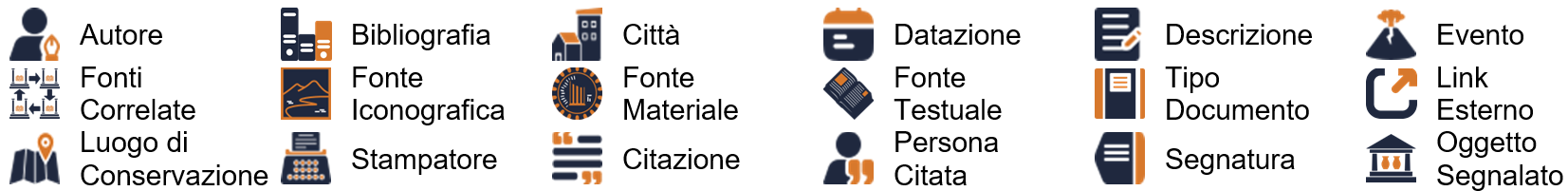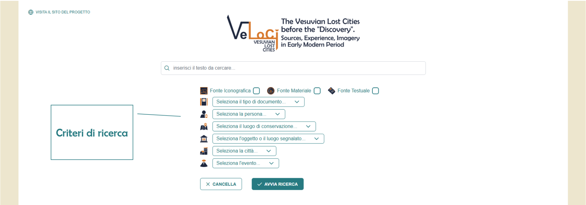 Nella ricerca avanzata, è possibile selezionare vari criteri per restringere la ricerca: tipo di fonte (iconografica, materiale e testuale), tipo di documento, persone, luoghi di conservazione, oggetti o luoghi segnalati, città ed eventi.