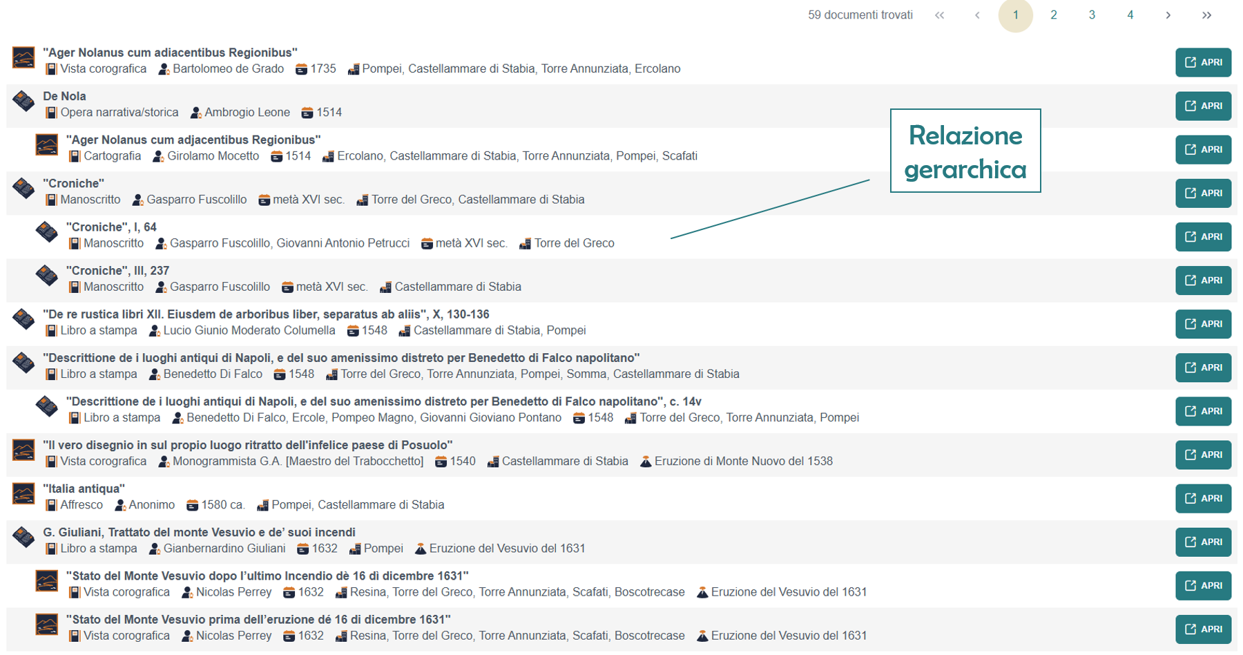 La lista dei risultati di ricerca mostra un'anteprima delle fonti trovate, mettendo in evidenza eventuali relazioni gerarchiche tra di esse. Se una fonte è parte di un documento più ampio, viene rappresentata con una leggera indentazione sotto la fonte principale.