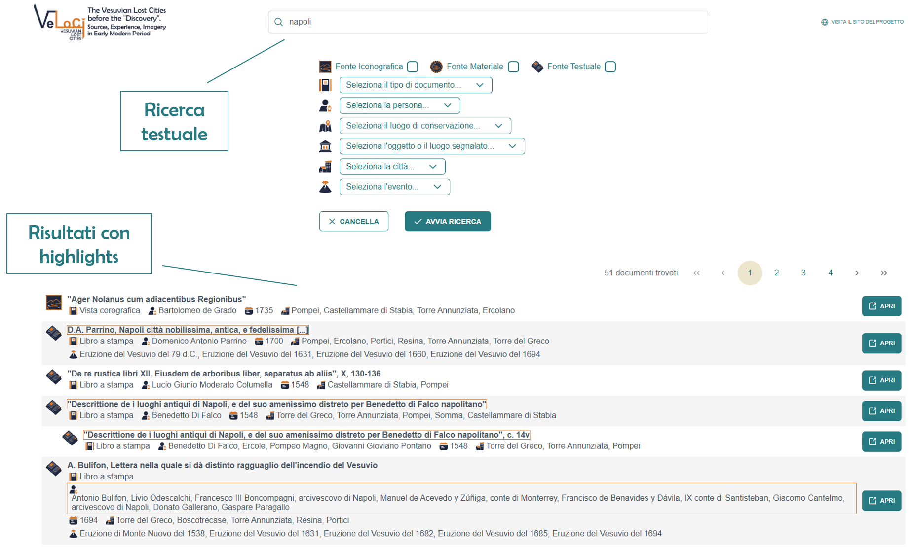 Se la richiesta include una ricerca testuale, i risultati evidenziano i campi in cui la parola cercata è stata trovata, facilitando ulteriormente la lettura e la navigazione.