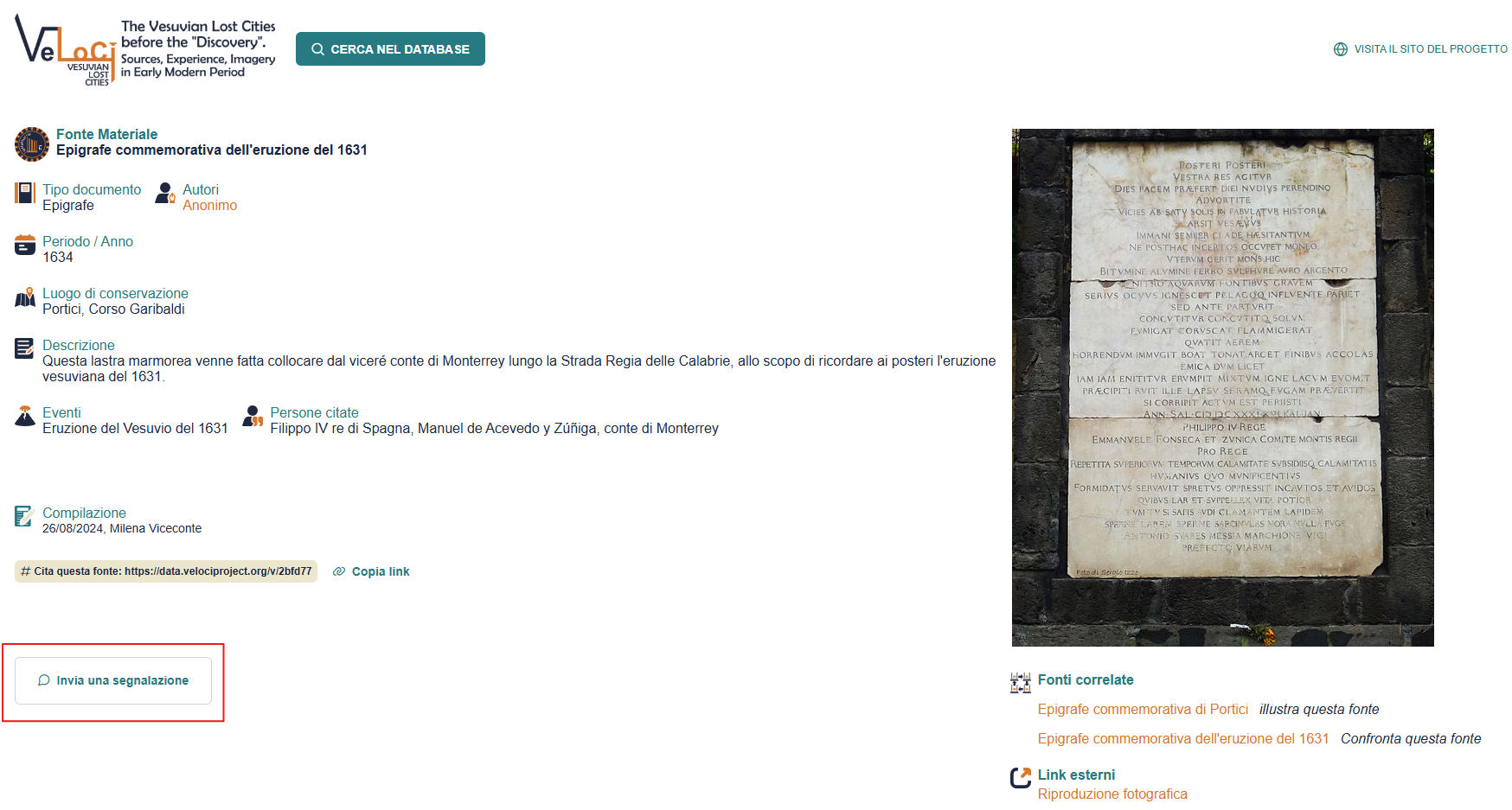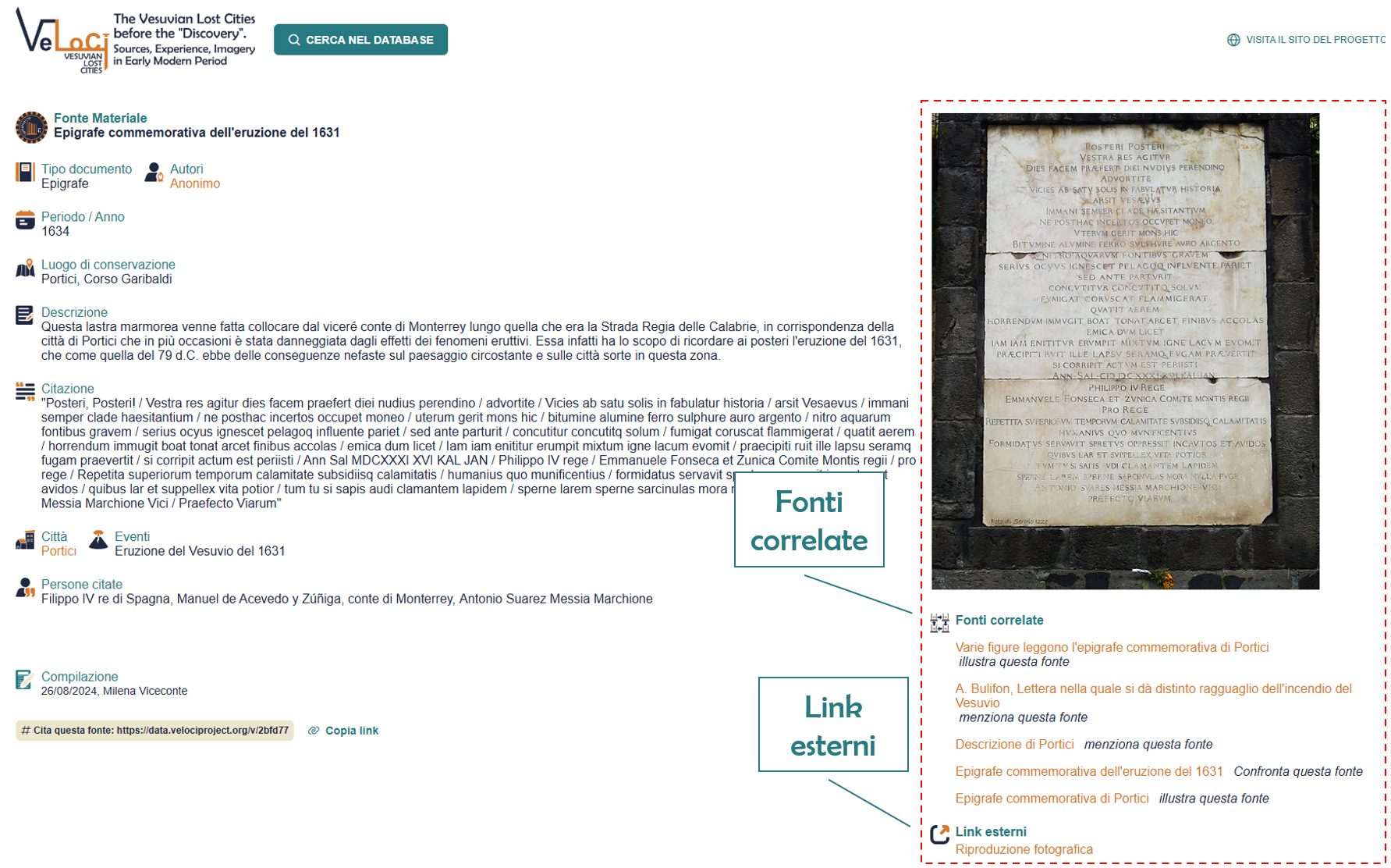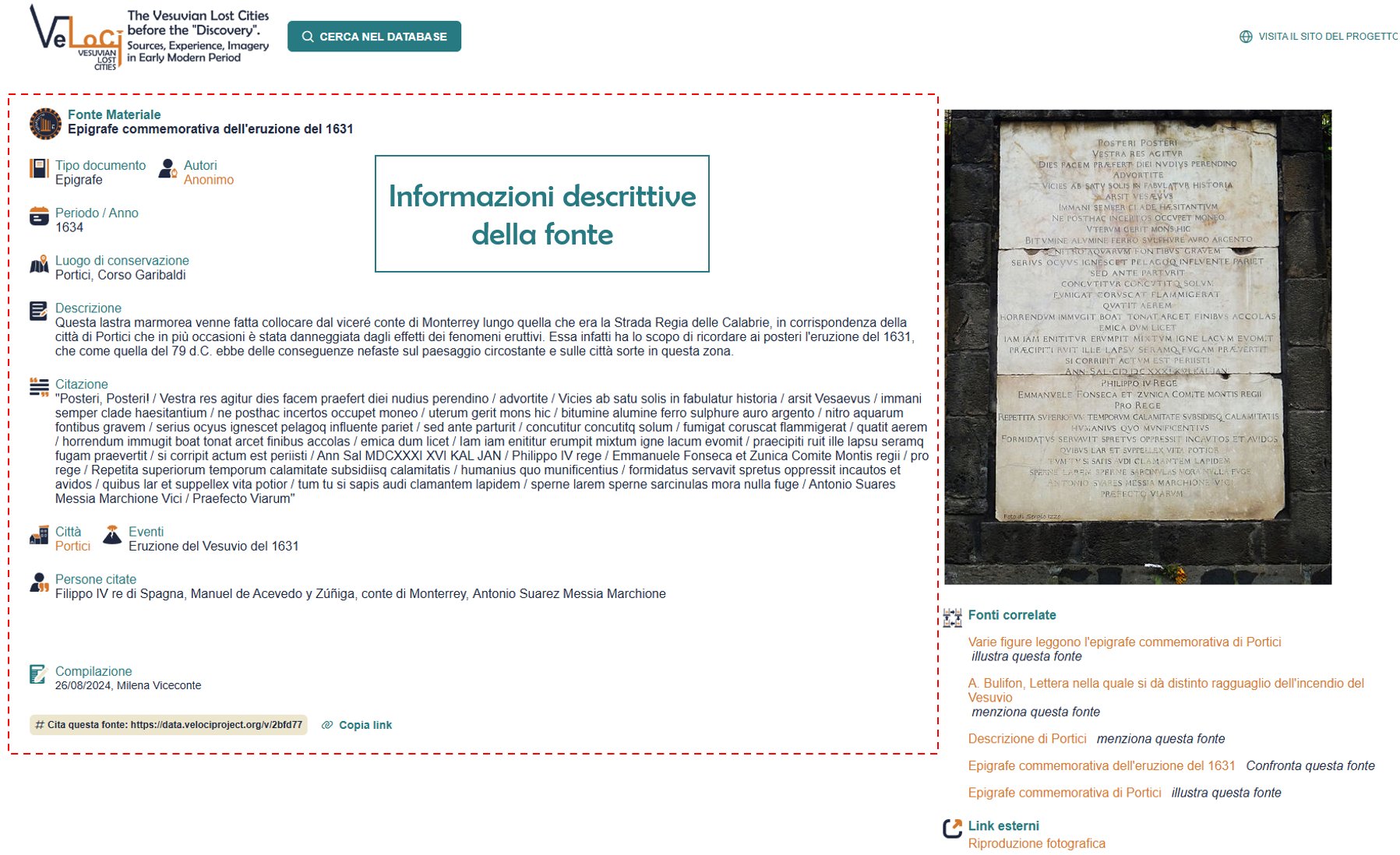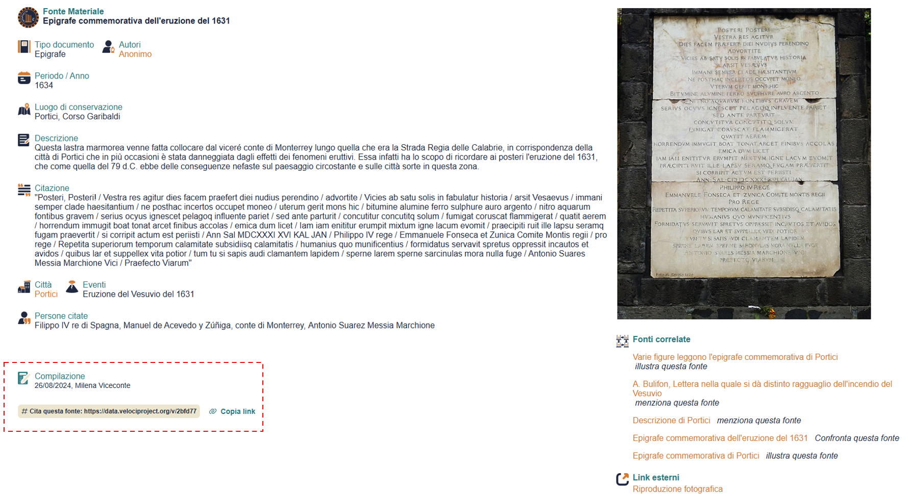 Ogni fonte riporta la data di compilazione della scheda e il nome del compilatore; oltre a un link permanente per la condivisione del documento.