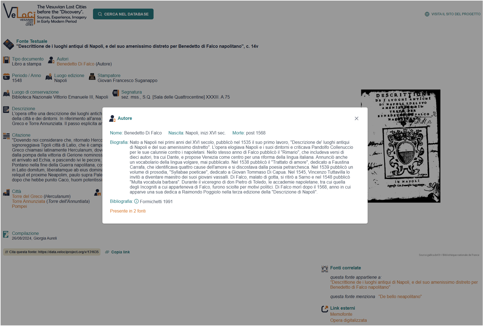 Gli autori e le città sono cliccabili, permettono di esplorare ulteriori informazioni sulle entità e di avviare nuove ricerche a partire da essi.