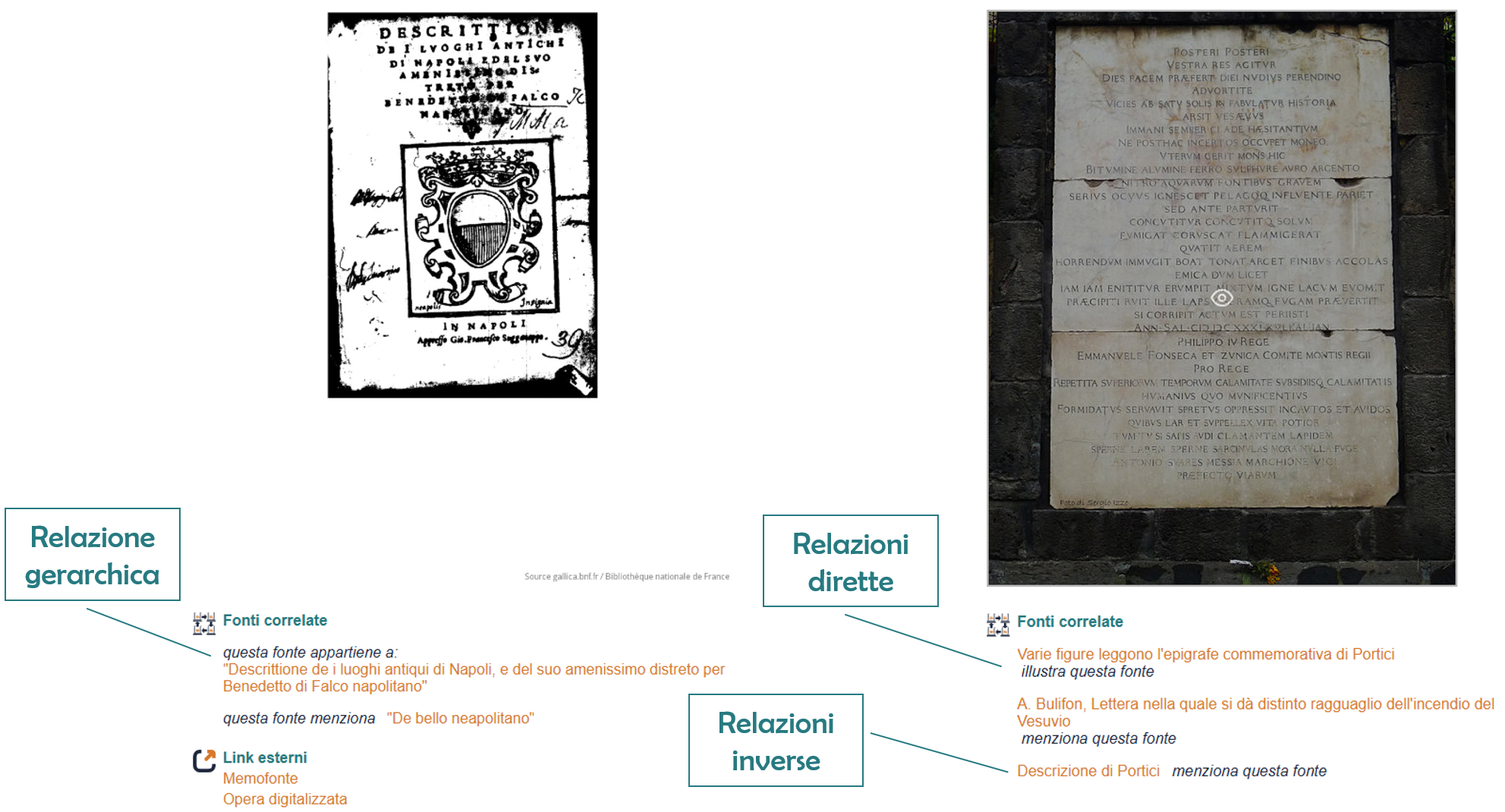 La colonna di destra è invece dedicata agli aspetti digitali della fonte, come immagini e link esterni. In essa sono riportate le relazioni che coinvolgono la fonte.